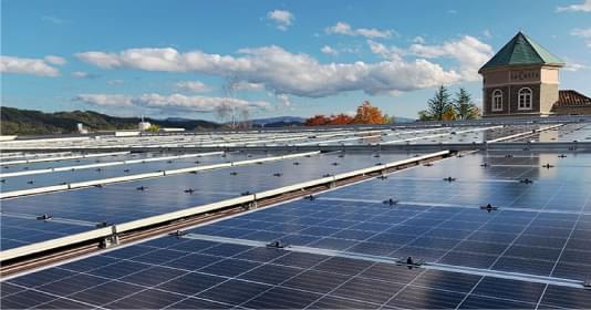 2020年に製造工場の屋根に設置されたソーラーパネルは、晴れた日には 70 %の電力をまかなっています。自然エネルギーを利用することによって、地球温暖化の要因となっている CO2 の削減に取り組んでいます。